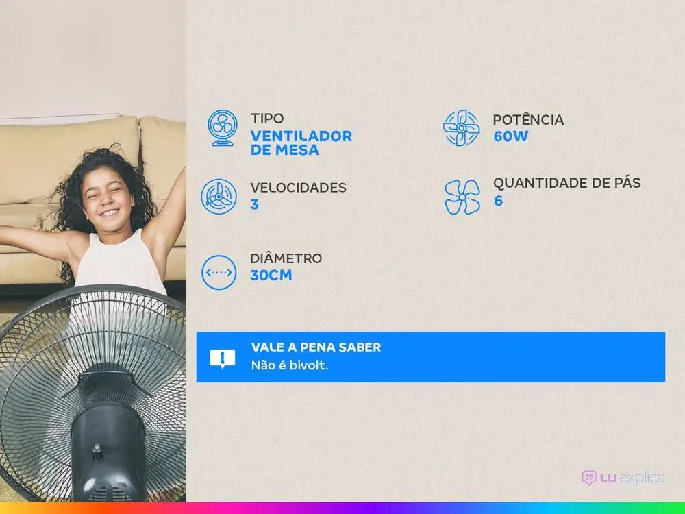 A practical option, portable and more economical to send away the heat is the Fan, is not it? If you're thinking of buying a new one, look at this Table Fan from Britannia. The Britania BVT301 Fan is a great choice to refresh with several functions for your well-being! There are 3 speeds that suit your needs, choose between the options soft, moderate and intense. The power of 60W, the propeller with new shape and the Maxx Force Technology, 6-blade propeller with 30cm, perform with higher air flow and ventilation capacity. Safety is not a problem, the motor with thermal fuse stops the operation of the product if there is overheating, in addition to the latching system of the grids. All this with low power consumption at any speed, thanks to its energy rating A. The Fan Britânia BVT301 Technology Maxx Force 60W makes all the difference to soften the heat providing comfort and freshness!