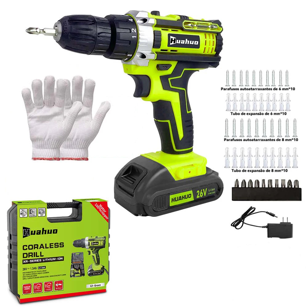 The complete screwdriver drill kit includes: 1 electric drill, 1 6500 mAh battery, 1 quick charger, 9 sockets, 20 self-tapping screws, 20 expansion tubes, 1 pair of gloves, 1 owner's manual and 1 kit of tools. Ideal for construction equipment, home modifications, and DIY projects. It is also a great choice as a gift for friends and family.